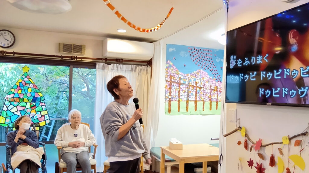 - 職員がピアノを弾き、生演奏で童謡や歌謡曲、懐メロや唱歌を一緒に歌う「歌の広